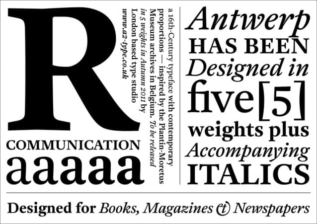 A2 Antwerp Font Family is inspired by typefaces from the sixteenth century and more directly by the collection of type specimens held in the archive at the Plantin-Moretus Museum in Antwerp, Belgium. Antwerp is an elegant, versatile text face inspired by the past but designed for use in today’s newspapers, books, and magazines.