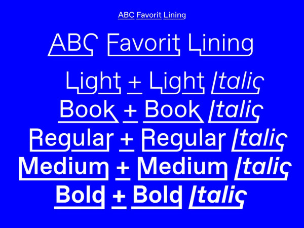 ABC Favorit Font is a straightforward, low-contrast grotesque that combines geometric rigidity with subtle oddities and a humorous touch. It’s available in five weights with corresponding italics, as well as a few special cuts and an underlined version, Favorit Lining. Additionally, there are the sub-families ABC Favorit Extended, ABCFavorit Expanded and the mono-spaced version ABCFavorit Mono. ABCFavorit Lining is the younger yet much smarter brother of ABC Favorit, as it has its own “smart underline” built straight into the font. With this feature, all descending characters can be merged to create unconventional letter shapes. Unleash its Connected mode, and the initial and final characters of individual words are conjoined by an extreme underline. ABC Favorit Lining is available in five weights with corresponding Italics.