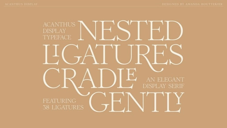 Pulling from the theatric and ornate art style, Acanthus Display typeface bends the rules to add decoration to the page through nested ligatures and alternates with dramatic swashes.