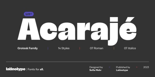 Acarajé Font is a grotesque font that stands out thanks to its versatility. Its personality blossoms through its particular modulation, which grows with weights; making it a rather jovial typeface that does not abandon the characteristics of more classic grotesques.