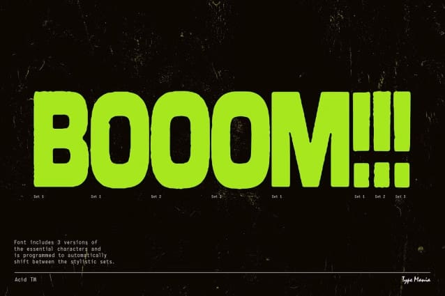 Acid TM Font is a rugged geometric sans serif. Perfect for your flyer, record cover or t-shirt design. It includes three stylistic sets of all the essential glyphs, which shift automatically to add character and texture.