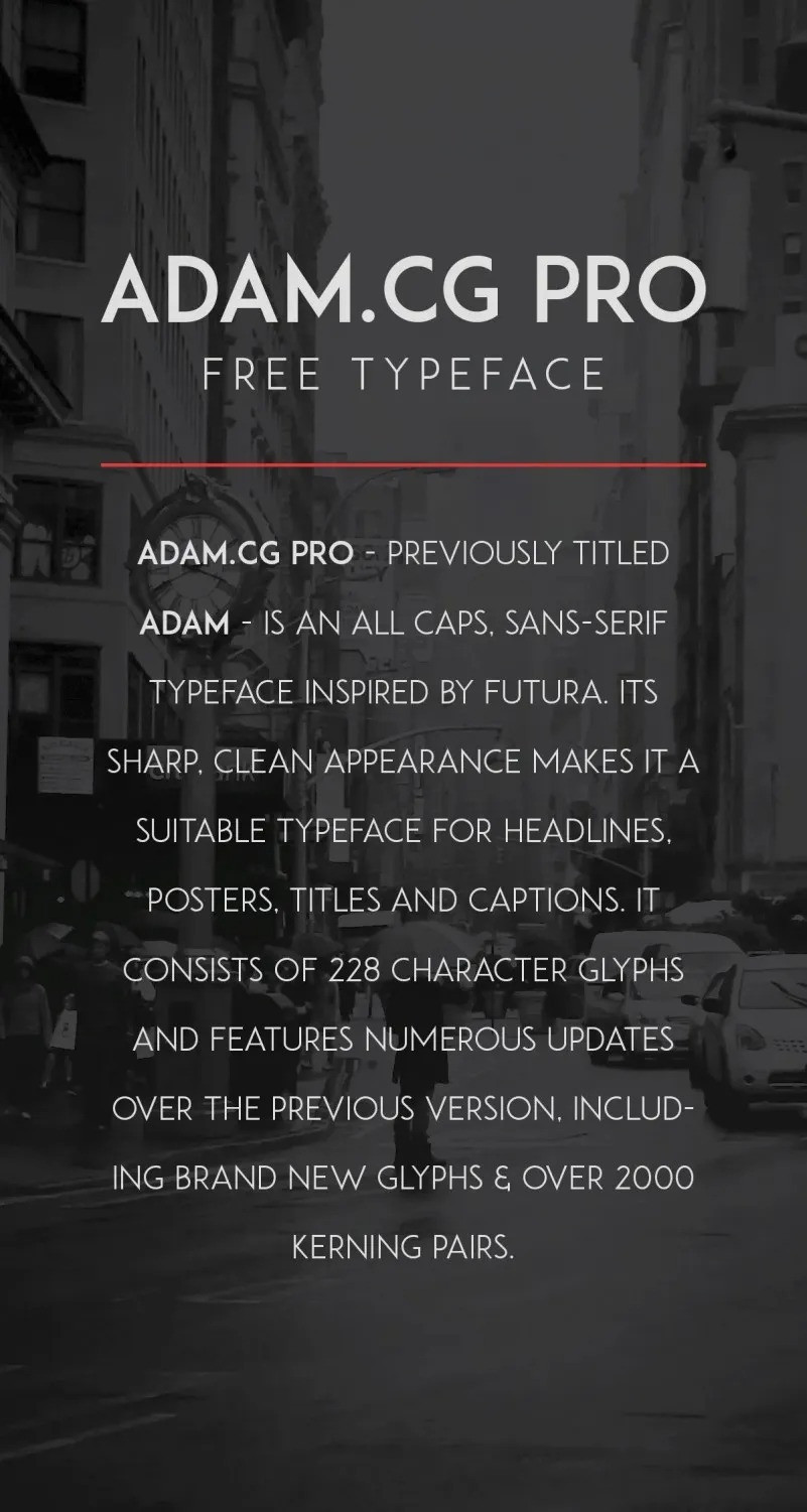 ADAM.CG PRO-Light Version is a part of the ADAM.CG PRO family, an All Caps, Modern Sans-Serif typeface inspired by Futura. The light version is optimized for both small and large sizes, which makes it a suitable typeface for all kinds of type, including body text, headlines, titles and logos.