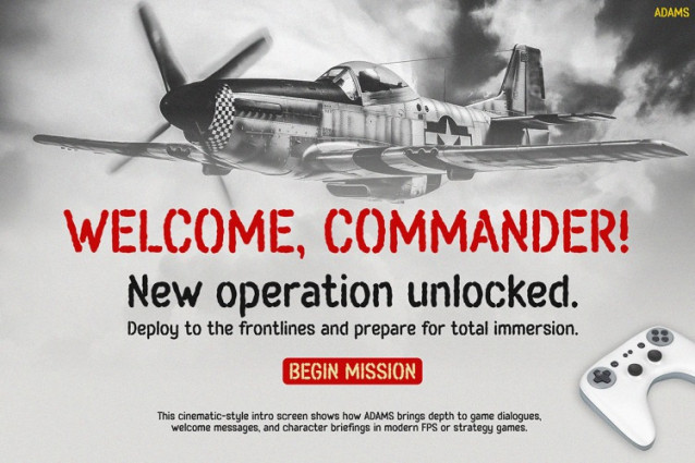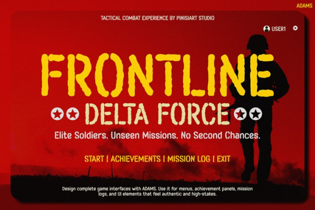 Each image showcases how ADAMS intensifies the tone of combat-themed content. For instance, in esports titles like G.A.M.E SQUAD: Special Forces Unit, the font turns text into part of the action. Likewise, game interfaces such as Frontline Delta Force feel more immersive with ADAMS. In addition, tech ads—like the one for the TITANVIEW 34Q monitor—gain boldness and authority.