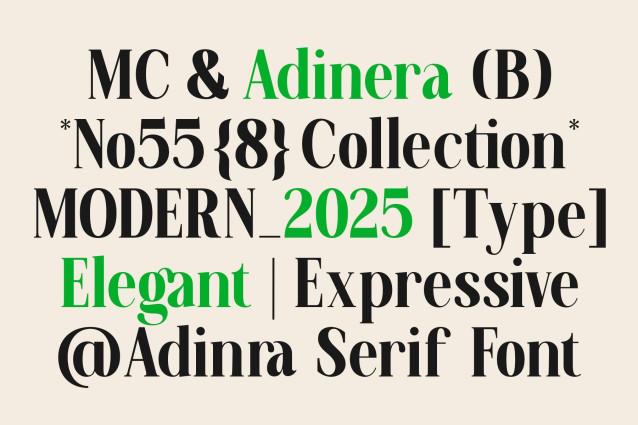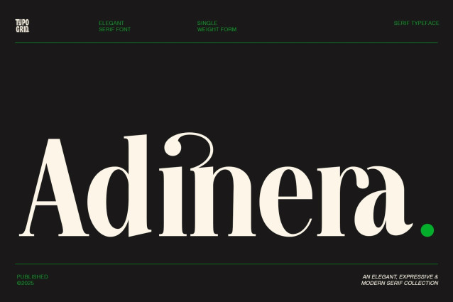 Adinera Font is a sophisticated serif typeface that blends timeless elegance with modern flair. Its high-contrast strokes, sculptural letterforms, and sharp serifs evoke a sense of luxury and editorial boldness — ideal for fashion, branding, and lifestyle design.