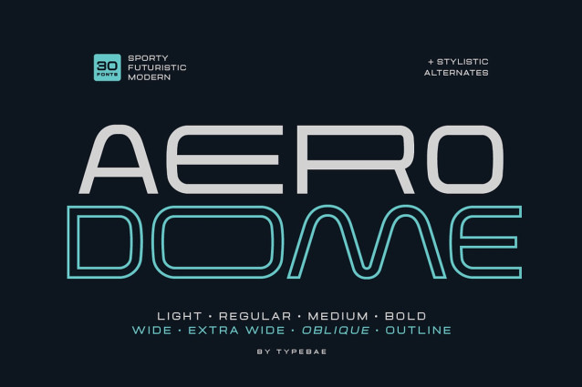 Aerodome Font is a modern futuristic font family designed to deliver a bold and clean look for high-impact designs. It comes as a variable font with 30 styles, including Light, Regular, Medium, Bold, with Wide, Extra Wide, Oblique, and Outline versions. To provide even more creative flexibility, Aerodome includes 20 stylistic alternates for unique letter variations.