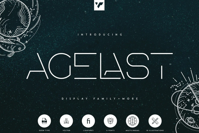 Agelast Font with 10 illustrations and 71 photoshop styles. Agelast is clean, futuristic typeface with 6 fonts, 10 breathtaking illustrations, 71 photoshop styles and multilingual support. It’s a very versatile font that works great in large and small sizes.