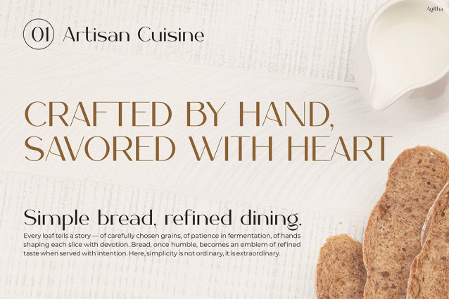This font not only decorates but also defines your designs. Use Agitha to elevate headlines, create sophisticated menus or design romantic wedding invitations. Every project is more impressive because Agitha ensures your words exude presence, confidence and sophistication.