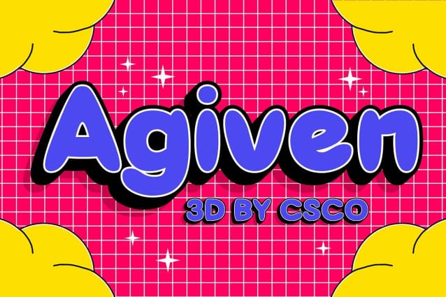 Agiven 3D Font is a font with bubble shapes for a cute and funky look, and a 3D style perfect for unique designs. Its playful appearance and three-dimensional elements create a lively and dynamic look, ideal for posters, branding, and other projects that require a touch of fun and creativity.