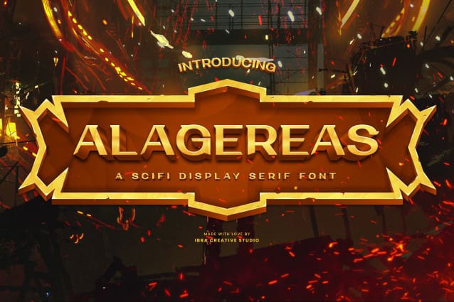 This font is used only for demos (Demo license). If you want to use this font for commercial use please contact: https://ibracreative.com/index.php/product/alagereas-a-scifi-display-serif-font/