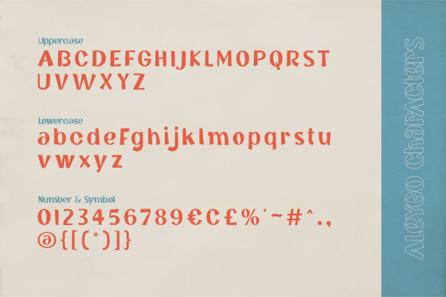 Aleygo DEMO Font is a fun and bold display typeface featuring Regular and Outline styles, designed to bring energy and charm to your visuals. Ideal for playful branding, bold posters, creative packaging, eye-catching social media graphics, and retro-inspired designs, Aleygo combines a whimsical look with a modern edge. Its quirky character makes it perfect for adding personality and uniqueness to any project.