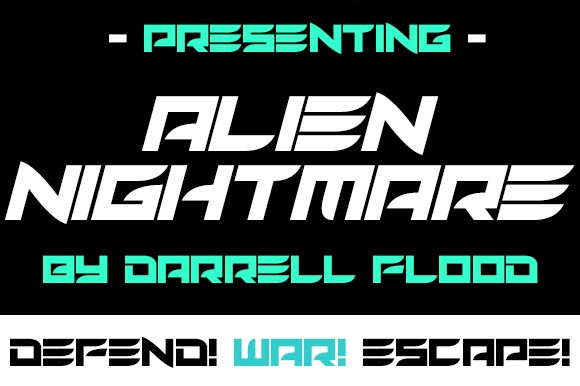 Alien Nightmare Display Font, a modern sci-fi font that combines sharp angles and smooth curves for a unique look. Perfect for high tech themes, alien encounters and general science use!