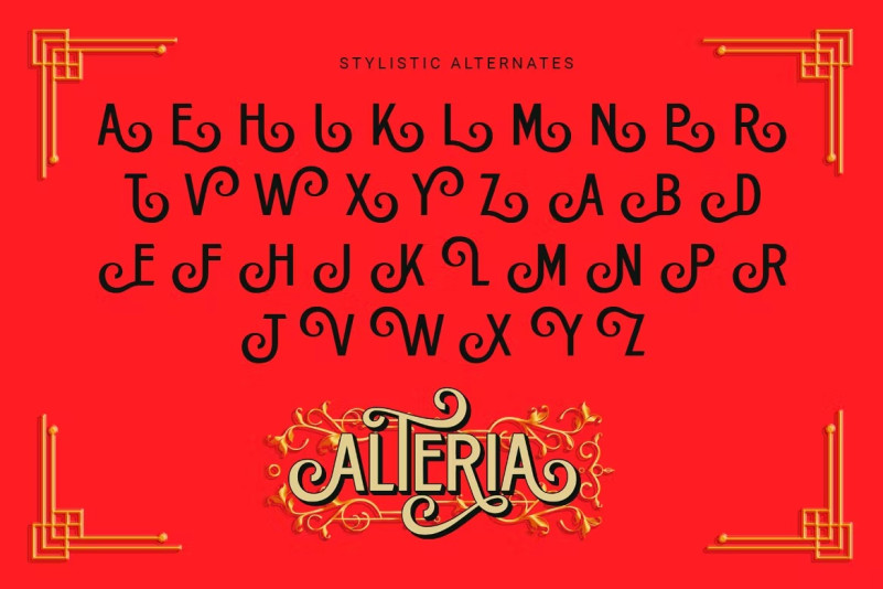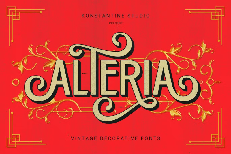 Alteria Font is a decorative vintage font. It was inspired by the trend of the Victorian era, print headlines, retro signs, newsletters and advertisements from the 50s.