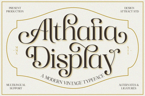 Althafia Display Font is a fancy display serif font with a unique character inspired by old-style serifs and contemporary serif fonts. Has dozens of fancy Alternates and Ligatures to combine in making Labels, signage, titles, logos, and many other creative projects.