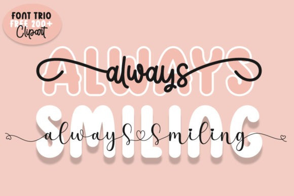 Always Smiling consists of trio fonts designed to complement each other perfectly. Together or apart, these fonts are ideal for adding a chic and cheery touch to your crafts. This font is PUA encoded which means you can access all glyphs and swashes with ease!