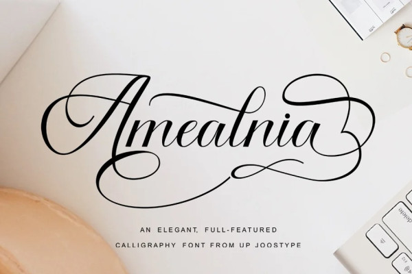 Amealnia Font is a new modern script font with an irregular baseline. Trendy and feminine style. Amealnia looks lovely on wedding invitations, thank you cards, quotes, greeting cards, logos, business cards and more. Perfect for using in ink or watercolor. Including initial and terminal letters, alternates, ligatures and multiple language support.