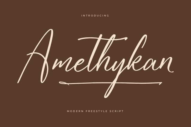 Amethykan Script Font – Modern Freestyle Script , from Letterena, is a Luxury Serif font, suitable for any projects such as: logos, branding projects, homeware designs, product packaging, mugs, quotes, posters, shopping bags, t-shirts, book covers, name card, invitation cards, greeting cards, label, photography, watermark, special events, and all your other luxury and beautiful projects that need a Luxury Script taste.