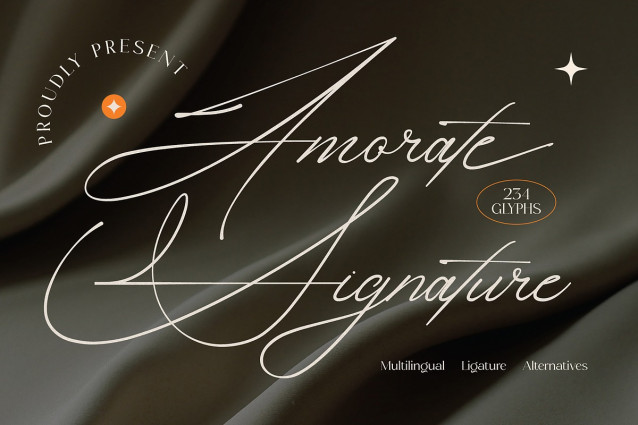 Amorate Signature Script Font is an elegant signature-style script font designed with long, flowing strokes and refined handwritten details. Its smooth curves and graceful letterforms create a luxurious, romantic, and personal feel-perfect for logos, branding, wedding designs, fashion editorials, and premium social media visuals.