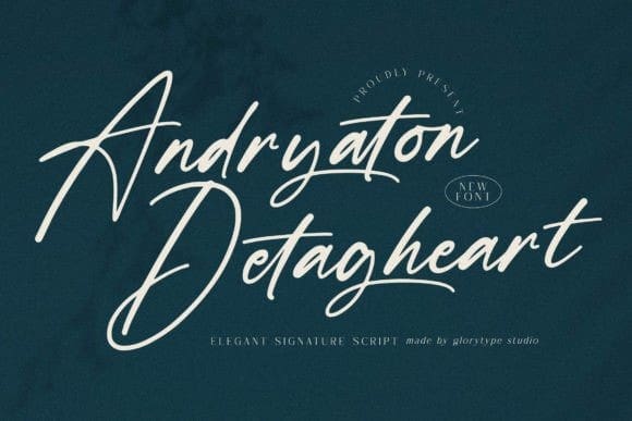 Andryaton Detagheart Font – Elegant Signature Script suitable for any projects such as logos, branding projects, homeware designs, product packaging, mugs, quotes, posters, shopping bags, t-shirts, book covers, name cards, invitation cards, greeting cards, labels, photography, watermark, special events, and all your other lovely projects that need a beautiful script taste.