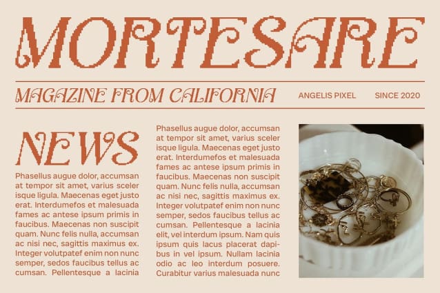 Angeris Pixel Font is a serif font with Art Nouveau styling that presents classic beauty and a unique retro touch. The pixel effect adds an intriguing modern dimension, creating a distinctive blend of traditional style and technological elements.