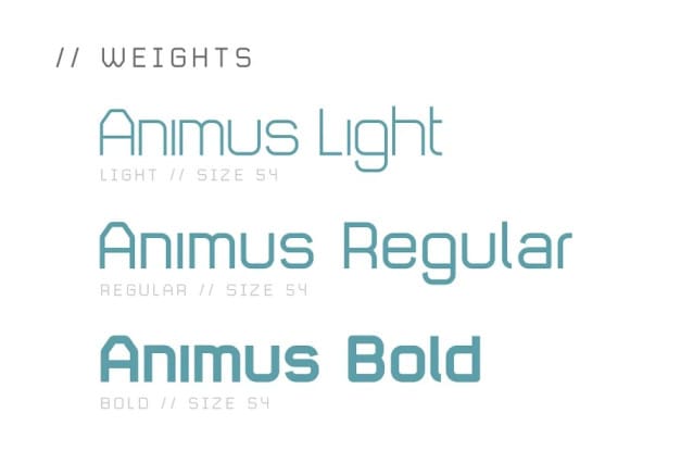 Animus comes in 3 weights: Light, Regular and Bold. Each weight has A-Z, 0-9, international language support and many supporting glyphs.