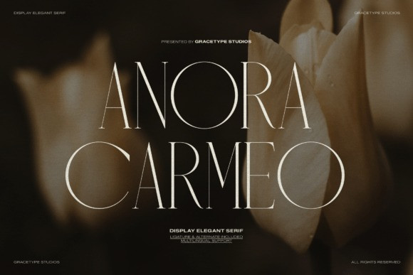 Anora Carmeo Font is a technical and sophisticated display font that captures a high-end, contemporary aesthetic. This elegant serif font features exceptionally tall and narrow letterforms rendered with high-contrast character geometry, balancing razor-thin lines with bold, stable stems.