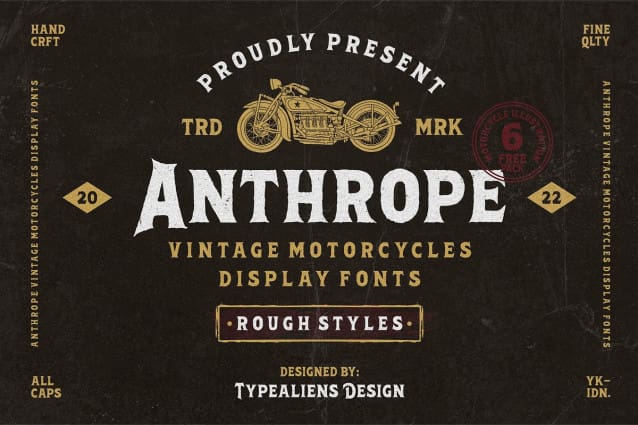 Anthrope Font is a serif font with a grunge style so it feels like a retro font, with a thick body that makes this font very manly. This font is perfect for designs related to male hobbies such as motorbikes. Besides that, this font is an all caps font, so this will add to the manly impression. All caps here still have the difference between Uppercase and Lowercase, which have different heights and different letter shapes.