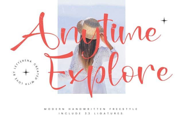 Anytime Explore Font – Modern Handwritten Freestyle, from Letterena, is a Luxury Script font, suitable for any projects such as: logos, branding projects, homeware designs, product packaging, mugs, quotes, posters, shopping bags, t-shirts, book covers, name card, invitation cards, greeting cards, label, photography, watermark, special events, and all your other luxury and beautiful projects that need a Luxury Script taste.