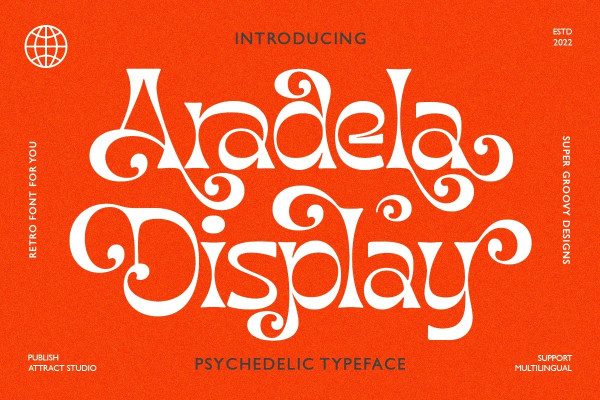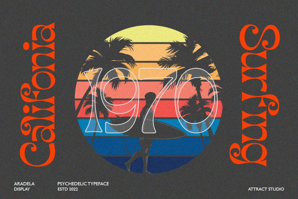 Aradela Display Font is a psychedelic style font with unique ornamental characteristics that will set your project apart from the rest. Aradela Display comes using the opentype feature to access ligatures and alternates, each glyph is created to create harmony. It will brighten up your work, for sure.