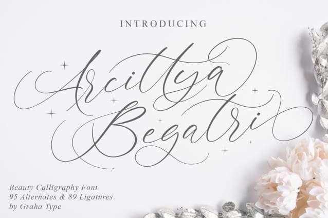 Arcittya Begatri Font is a beauty calligraphy font designed to elevate the elegance and sophistication of your designs. With its unique and fluid flow, this font is perfect for invitations, logos, branding, and more, enhancing the quality of your design projects.