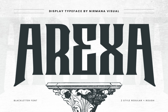 Arexa Font is a bold fusion of classic serif and blackletter style, crafted to bring a strong vintage character to your design. Available in Regular and Rough styles, Arexa delivers versatility for creating standout logos, labels, posters, and more. Its unique mix of elegance and raw texture makes it perfect for vintage branding, apparel design, packaging, or any project that needs a timeless yet powerful typographic touch.