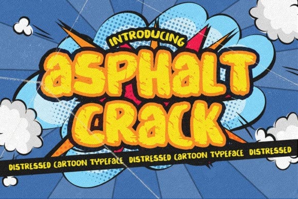 Asphalt Crack Font is a distressed cartoon display font inspired by modern logos and brands with strong characteristics. It is suitable for posters, children’s cards, and it is guaranteed to add a sweet touch to packaging, branding, logotypes, and more.