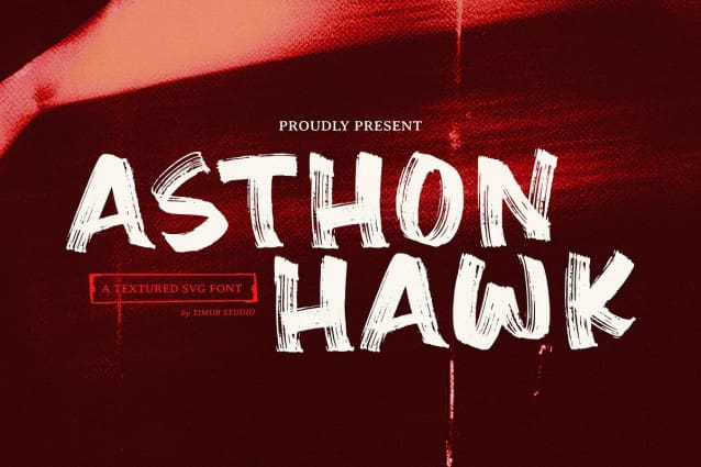 Asthon Hawk Font. This font is a combines the flexibility of scalable vector graphics with intricate surface patterns, giving each character a unique, tactile quality. Ideal for eye-catching headlines and creative designs, these fonts feature rich textures—like grunge, fabric, or organic patterns—enhancing visual interest while maintaining sharpness at any size. Perfect for branding, posters, and digital art, textured SVG display fonts elevate typography to an art form, allowing designers to express personality and style in a striking way.