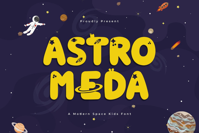 Astromeda Font a modern and playful font inspired by the mysteries of the galaxy. Designed with kids in mind, this typeface features bold shapes and quirky letterforms, perfect for space-themed activities, posters, science projects, and branding.