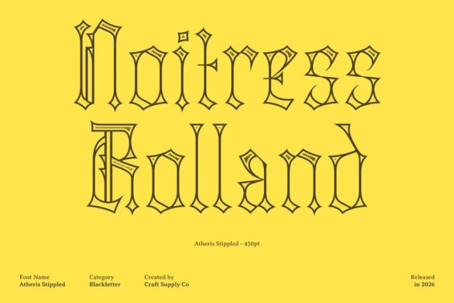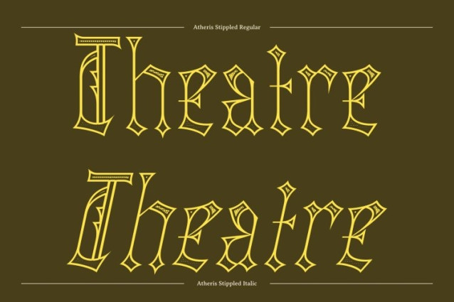 Atheris Stippled Font This is a contemporary blackletter display font that reinterprets classic broken letterforms with a bold, experimental approach. While honoring the sharp, dramatic structure of traditional blackletter, the stippled style introduces a dense dotwork texture reminiscent of ink stippling and hand-drawn illustration. This adds a distinctive artistic and vintage feel, giving the font depth, character, and a handcrafted aesthetic.