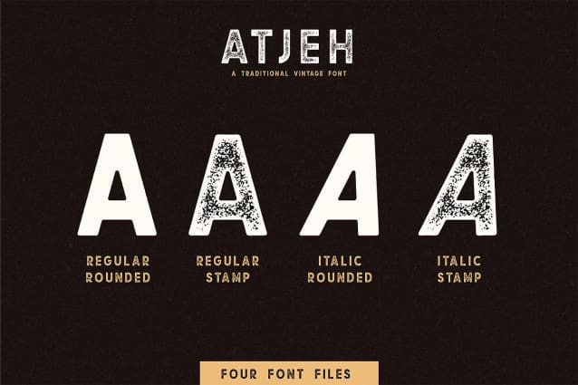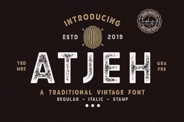 Atjeh Font is a traditional vintage display family including Regular and Textured versions as well as Italic versions of each. it’s perfect for logos, name card, magazine layouts, invitations, headers, or even large-scale artwork.