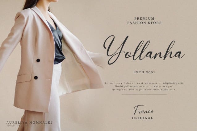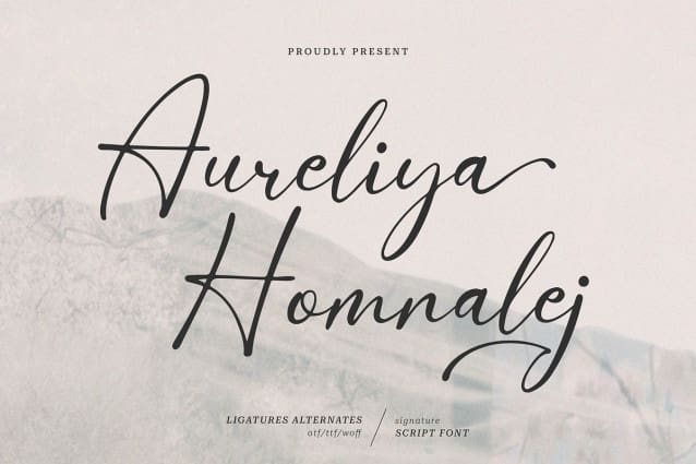 Aureliya Homnalej Font| Elegant Script, from Denustudios, suitable for any projects such as: logos, branding projects, homeware designs, product packaging, mugs, quotes, posters, shopping bags, t-shirts, book covers, name card, invitation cards, greeting cards, label, photography, watermark, special events, and all your other lovely projects that need a elegant script taste.