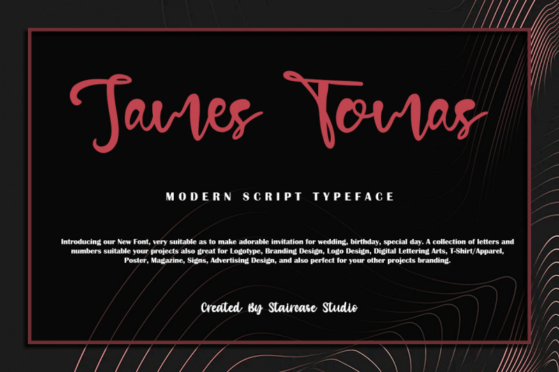James Tomas Script Font by Staircase_Studio 19,896 downloads Found in: Calligraphy Fonts, Script Fonts James Tomas Script Font