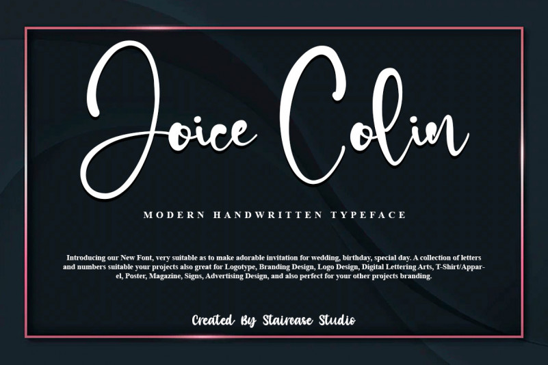 Joice Colin Script Font by Staircase_Studio 18,779 downloads Found in: Calligraphy Fonts, Handwritten Fonts, Script Fonts Joice Colin Script Font