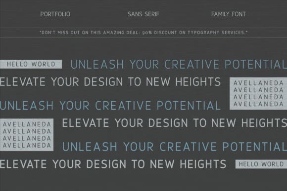 Avellaneda Font Family, a pure expression of understated elegance intertwined with minimalist aesthetics. Comprising five sleek weights, this sans serif suite is the harmonious marriage of contemporary style and luxurious appeal. Precision engineered, Avellaneda effortlessly elevates your projects, infusing flair into magazines, adding charm to logos, or boosting the appeal of film posters. Experience an unparalleled blend of sophistication and simplicity, enhancing your designs with a touch of enduring allure. Harness the potent elegance of the Avellaneda font family today.