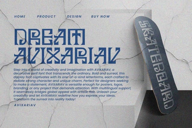 Perfect for designers seeking to make a statement, Avixariav Display is versatile enough for posters, logos, branding, or any project that demands attention. With multilingual support, it seamlessly bridges global appeal with artistic flair.