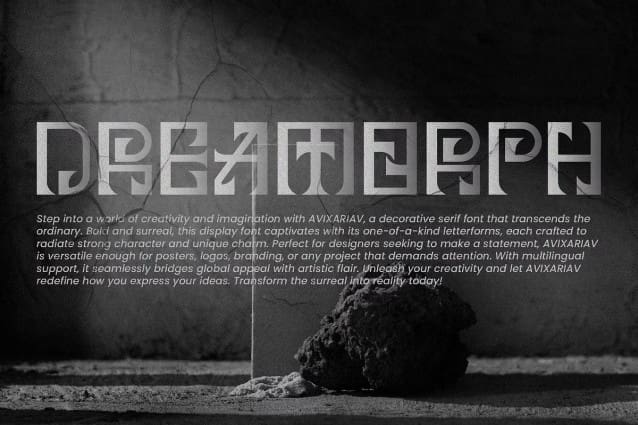 Avixariav Display Font, a decorative serif font that transcends the ordinary. Bold and surreal, this display font captivates with its one-of-a-kind letterforms, each crafted to radiate strong character and unique charm.