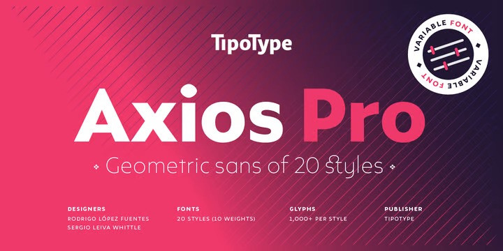 Axios Pro is available in variable font format and in 20 different individual styles (10 weights), with a set of more than 1000 glyphs per style, supports over 200 latin languages and including an extensive repertoire of opentype features like small caps, ligatures, stylistic alternates, proportional and tabular figures, swashes, borders and many other resources to please your typographic urges.