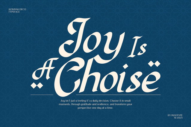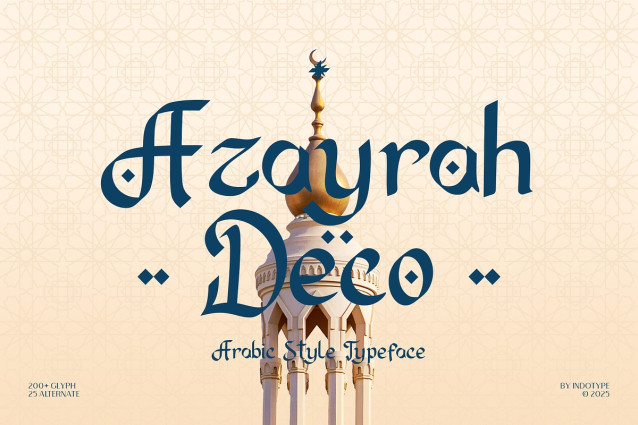 Azayrah Font is an elegant and intricately detailed display typeface that masterfully blends the timeless beauty of Arabic calligraphic forms with the geometric precision of the Art Deco era. This unique fusion creates a font that is both exotic and sophisticated, perfect for adding a touch of luxury and cultural resonance to your designs. With a generous character set of over 200 glyphs, including 25 stylish alternates, Azayrah Deco offers immense creative flexibility. These alternates allow you to customize words and logos, ensuring your designs remain unique and fluid. Ideal for high-end branding, fashion headlines, product packaging, and decorative titles, Azayrah Deco brings an air of ornate elegance to any project that demands distinction and style. • Ideal for: Luxury Logos, Fashion Branding, Product Packaging, Poster Headlines, Wedding Invitations, Cultural Projects. • Classification: Display, Decorative, Arabic-Style, Art Deco. • Attributes: Ornate, Elegant, Intricate, Cultural, Luxurious, Sophisticated.