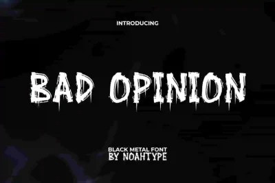 Bad Opinion Font is a textured sketched rough brush dark and hideous Black Metal font by NoahType. This font has a strong character as if it was made from a paint brush that was still wet and flowing down. It will be perfect for any designs, such as custom design, brand image, poster, label, invitation, cover, marketing material, menu, printing, product packaging, quotes, signage, website, and many more!