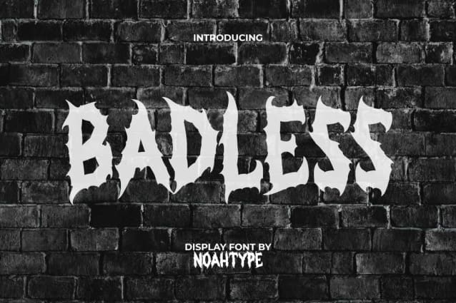 Badless Display Font is a strong valiant display font with blackmetal style, created by NoahType. This font has a creepy look with thorns all over the characters. It will be perfect for any designs, such as brand image, cover, custom design, invitation, label, marketing material, menu, poster, printing, product packaging, quotes, signage, website, and many more!