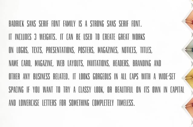Badrick Font is an elegant condensed typeface without serifs. With 3 different weights, it offers versatility for a variety of design projects. This font is perfect for creating eye-catching logos, compelling texts, engaging presentations, captivating posters, professional magazines, informative notices, bold titles, memorable name cards, captivating web layouts, standout invitations, striking headers, and cohesive branding for any business or industry.