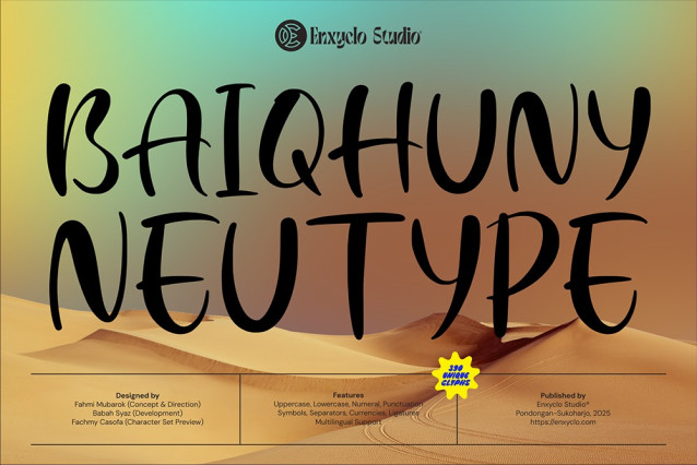 Baiqhuny Font, a bold and dynamic handwritten typeface designed to bring personality and energy to your designs. Crafted by Enxyclo Studio, this font features unique strokes and expressive letterforms that balance between casual and artistic style, perfect for making your text stand out with charm and character.