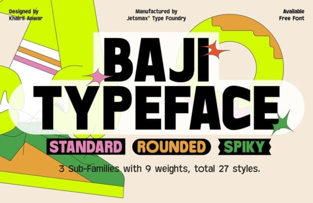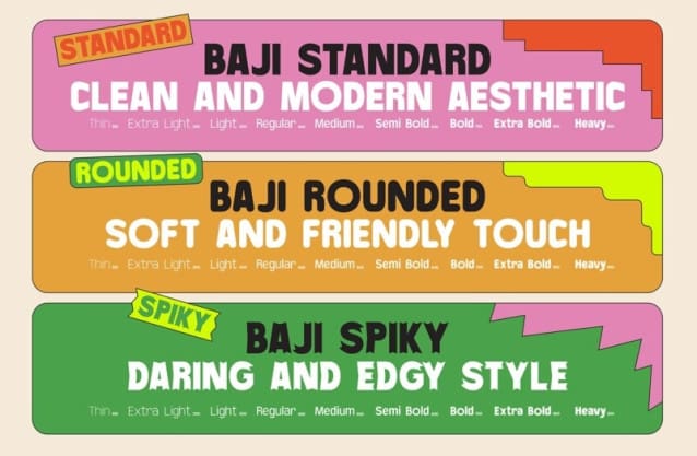 Baji Typeface Family is a versatile sans-serif typeface that offers three distinct sub-families: standard, rounded, and spiky. With its nine weight variations, it provides a wide range of options to suit different design needs.