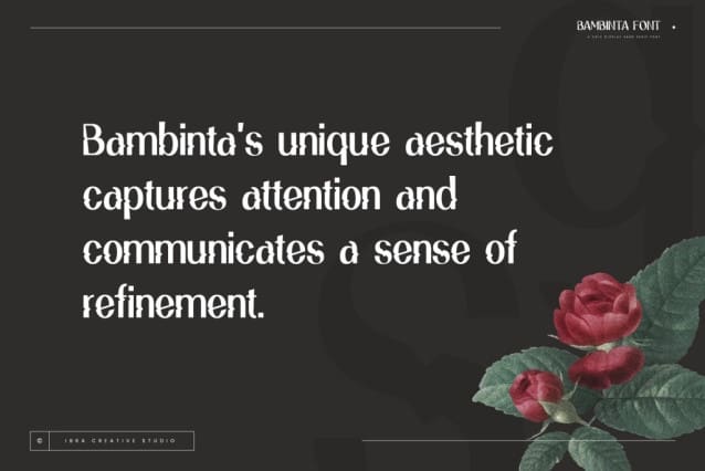 Bambinta Display Font is perfect for branding projects, logo, wedding designs, social media posts, advertisements, product packaging, product designs, label, photography, watermark, invitation, stationery, game, fashion and any projects.