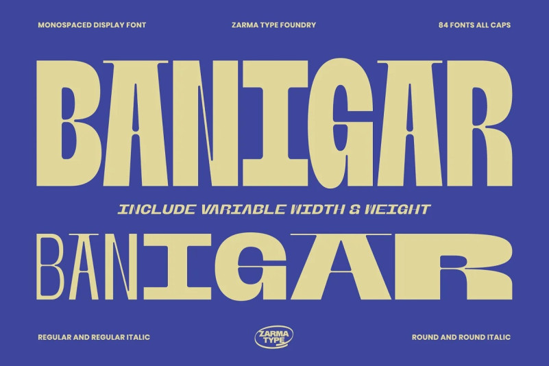 Introducing Banigar Display font family! Comes with 4 styles including regular, italic, rounded, and rounded italic. Also available in 7 Weights (Light, Regular, Medium, Semi-Bold, Bold, Extra-Bold, Black) and 3 Widths (Condensed, Normal, Expanded) on each style with total 84 fonts.